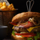 Hamburguesa de lagarto Ibérico con queso azul, bacon, cebolla caramelizada, rúcula, tomate rosa y piña asada, con nuestro pan especial brioche