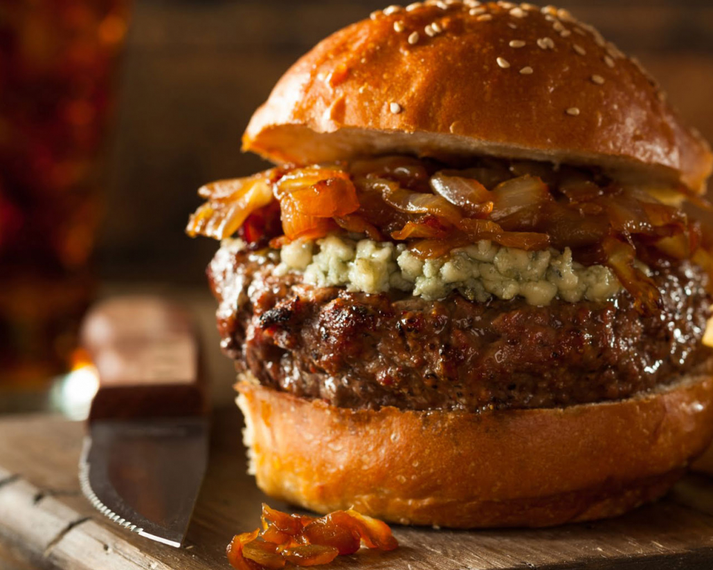 Hamburguesa de lagarto Ibérico con queso azul, bacon, cebolla caramelizada, rúcula, tomate rosa y piña asada, con nuestro pan especial brioche